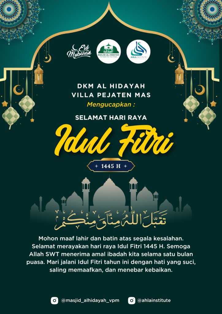 Taqabbalallhuminna wa minkum. Selamat merayakan hari raya Idul Fitri 1445 H. Semoga Allah SWT menerima amal ibadah kita selama satu bulan puasa Ramadhan. Mari jalani Idul Fitri tahun ini dengan hati yang suci, saling memaafkan, dan menebar kebaikan.
